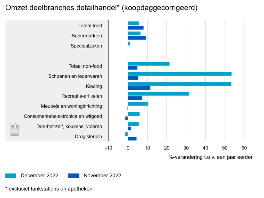 De omzet van de non-foodwinkels groeide in december 2022 met 21,5 procent. Het volume (de voor prijsveranderingen gecorrigeerde omzet) was 11,1 procent hoger dan een jaar eerder. Op 19 december 2021 werd opnieuw een strenge lockdown ingesteld om besmettingen van het coronavirus tegen te gaan. Veel non-foodwinkels moesten toen hun deuren sluiten.