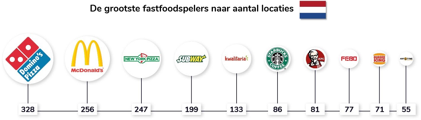 Fastfoodketens tellen in Nederland samen ruim 1.900 restaurants. Domino’s (328 locaties), McDonald’s (256 locaties) en New York Pizza (247) hebben de meeste vestigingen. Het grootste aantal fastfoodlocaties vind je in Amsterdam (167x), Rotterdam (98x), Den Haag (56x) en Utrecht (50x).