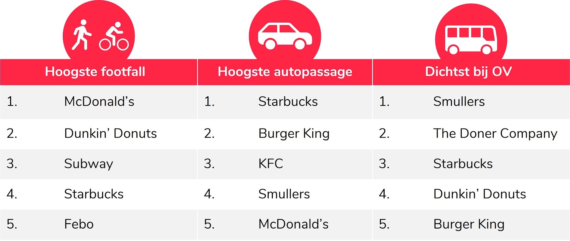 McDonald’s, Dunkin’ Donuts, Subway, Starbucks en Febo behoren tot de laatste categorie. Deze fastfoodspelers kom je het vaakst tegen in binnensteden met veel footfall.