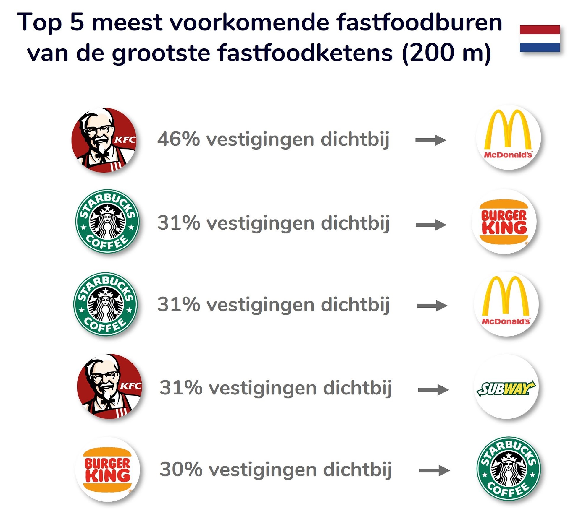 Opvallend: bijna de helft (46%) van de KFC-vestigingen heeft een McDonalds als buur. “Sommige ketens richten zich op dezelfde doelgroep en kiezen daarom vaak voor gelijkaardige locaties. Dat hoeft geen probleem te zijn want het levert beide ketens extra naamsbekendheid op en bezorgt consumenten extra keuzemogelijkheden. Aan hen om te bepalen welk restaurant de “ local hero ” wordt.”