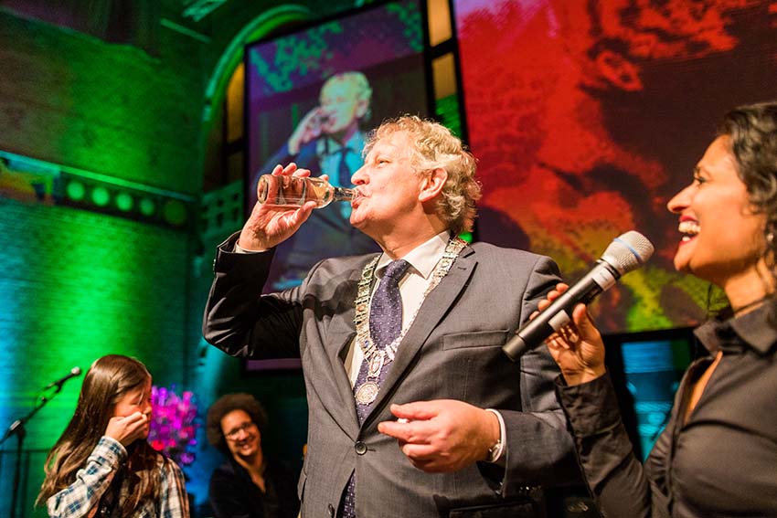De Beurspassage aan het Damrak in Amsterdam is sinds vrijdag 2 december officieel open voor het publiek. Burgemeester Eberhard van der Laan kreeg als eerste een flesje Amsterdam Oersoep aangeboden, waarna hij een slok nam van het water uit de bron, onderdeel van het kunstwerk. Dit water wordt door de kunstenaars Arno Coenen, Iris Roskam en Hans van Bentem ook wel ‘tolerance elixer’ genoemd.