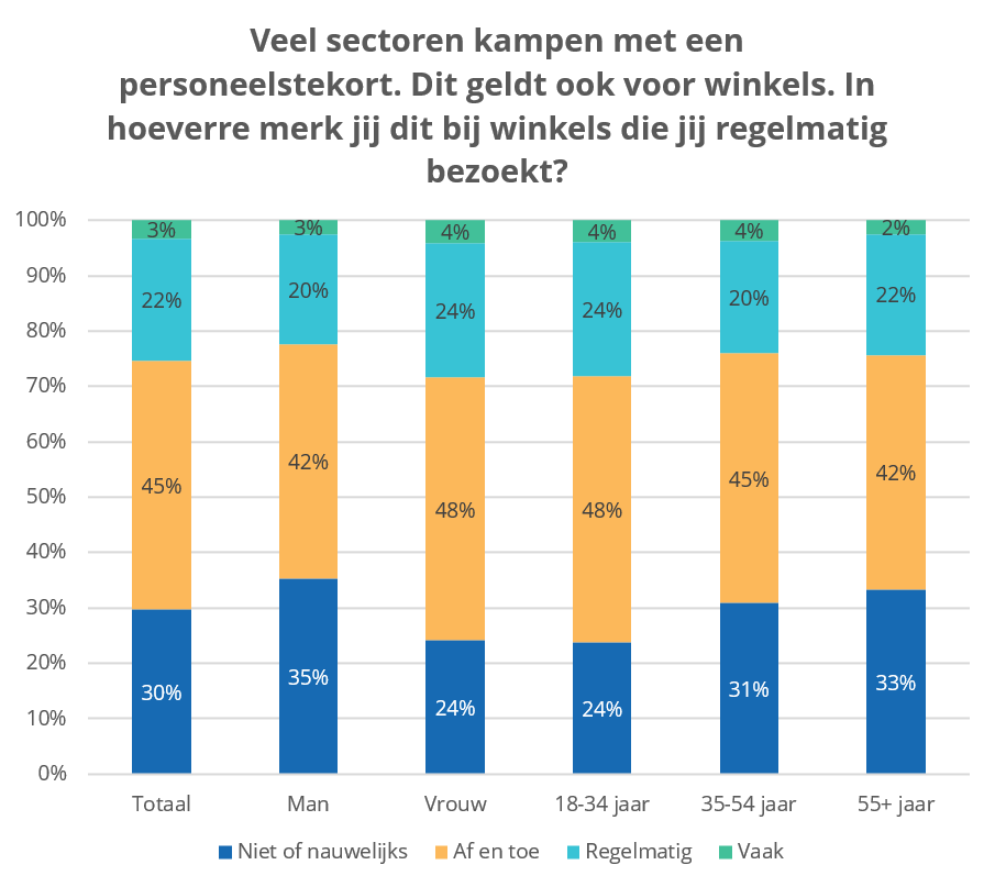 Veel sectoren kampen met een personeelstekort. Dit geldt ook voor winkels. Slechts 30% van de consumenten ervaart niet of nauwelijks personeelsproblemen. 70% merkt dit wel degelijk en 25% geeft aan dit regelmatig tot vaak te ervaren. Als gevolg voor het personeelstekort moet je bij winkels soms langer wachten op hulp. 52% geeft aan daar af en toe tot veel last van te hebben. Algemeen geldt dat de leeftijdsgroep 18-34 jaar het meeste last ervaart van de personeelstekorten bij winkels.
