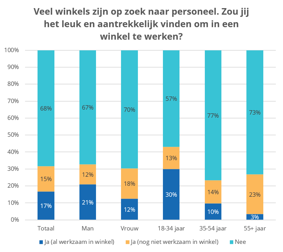 De oplossing voor personeelstekort is de werving van personeel. Maar liefst 68% van de Nederlandse beroepsbevolking lijkt het niet leuk en aantrekkelijk om in een winkel te werken. Mensen die de winkel niet aantrekkelijk vinden geven aan dat het saai, eentonig, stressvol of chaotisch is (22%), het loon niet aantrekkelijk is (12%) of het fysiek te zwaar is (5%). Daarnaast geeft 45% aan de winkel als werkplek niet aantrekkelijk te vinden omdat ze het elders al naar de zin hebben. Mensen die in de winkel werken doen dat vooral omdat het leuk en gezellig is (46%).