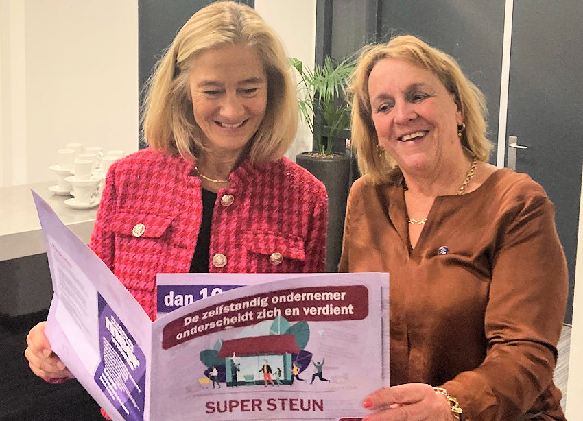 Vanochtend presenteerde Vakcentrum-bestuurslid Froukje Mulder een bloemlezing aan demissionair minister-president Mark Rutte tijdens een bijeenkomst in het kader van de Dag van de Ondernemer. Demissionair minister van Economische Zaken en Klimaat Micky Andriaansens ontving een SUPER STEUN krant uit handen van Vakcentrum-directeur Patricia Hoogstraaten. (hoofdfoto)