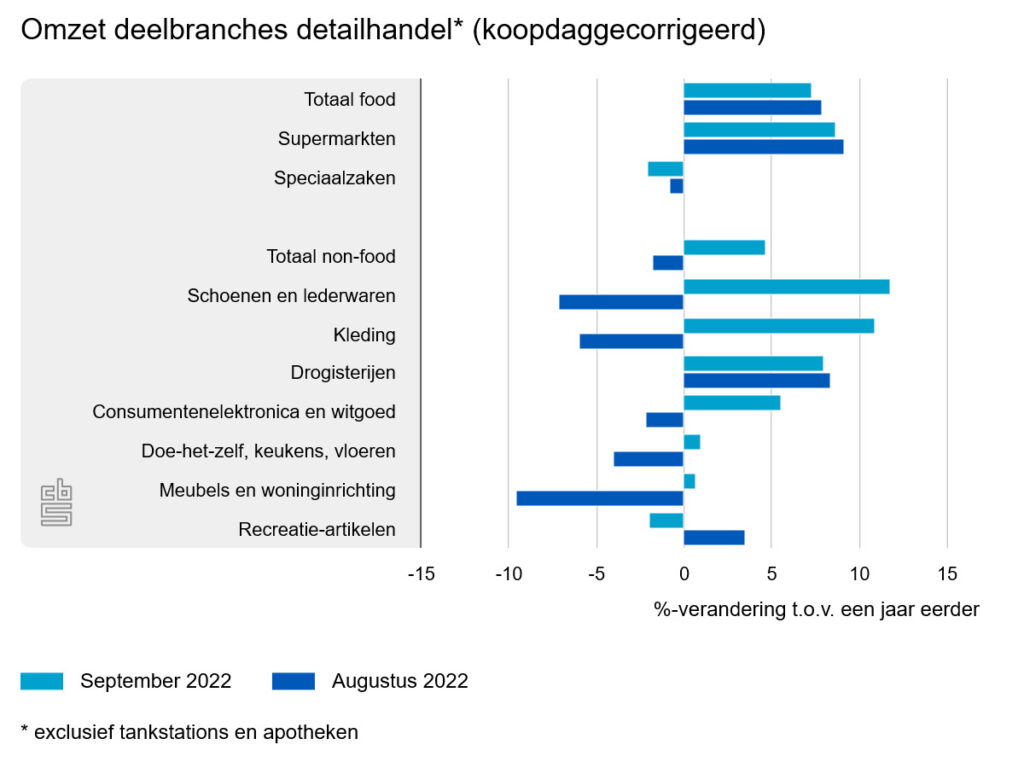 De winkels in voedings- en genotmiddelen hebben in september 7,3 procent meer omzet behaald dan in september 2021. Het verkoopvolume was echter 3,4 procent lager dan een jaar eerder. De omzet van de supermarkten lag 8,7 procent hoger terwijl die van de speciaalzaken 2 procent lager was.