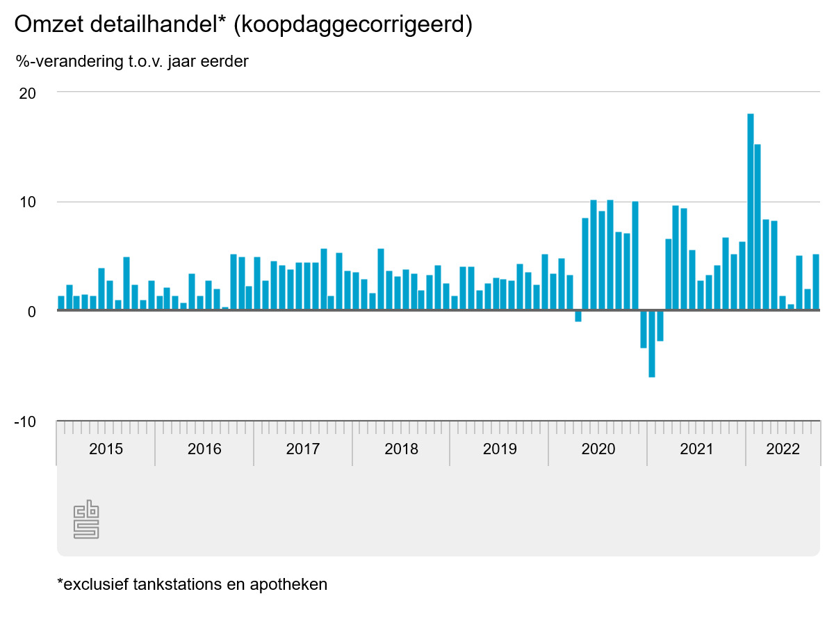 De omzetcijfers zijn gecorrigeerd voor de samenstelling van koopdagen in september. Op sommige dagen van de week wordt meer verkocht dan op andere dagen. Zonder deze correctie was de omzet van de detailhandel 5,9 procent hoger dan in september 2021.