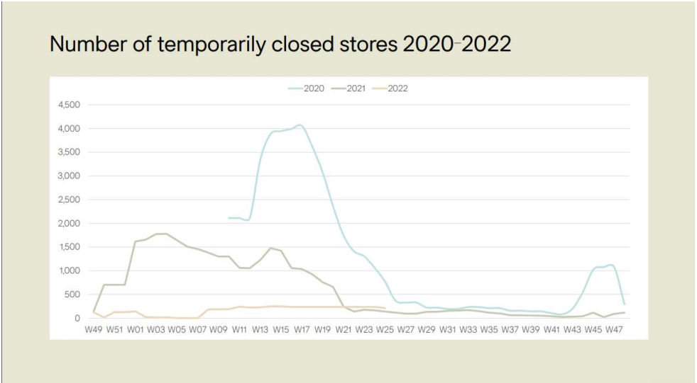 De overeenkomsten en verschillen zijn ook goed terug te zien in de ontwikkeling van de beurskoersen (zie grafiek 1). Zowel H&M en Zalando hebben last van recessie-angst onder beleggers. Beide aandelen bevinden zich ongeveer op het niveau van voor de coronacrisis. Daar waar Zalando op de beurs in de afgelopen twee jaar profiteerde van een “coronabonus” in de vorm van een pure online retailer met door overheden ondersteunde consumenten, voelde H&M de pijn van gesloten winkels (zie grafiek 2). Nu overal ter wereld de corona-lockdowns ten einde lijken te komen zijn de rollen omgedraaid. De goede kwartaalcijfers van H&M leveren het bewijs.