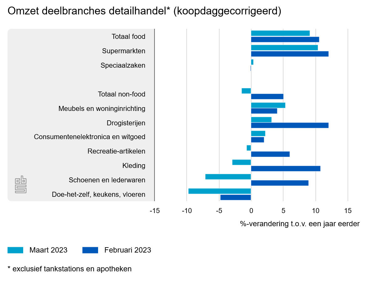 De winkels in voedings- en genotmiddelen hebben in maart 9,2 procent meer omzet behaald dan in maart 2022. Het verkoopvolume was 5,7 procent lager dan een jaar eerder. De omzet van de supermarkten lag 10,4 procent hoger, de omzet van de speciaalzaken was 0,4 procent hoger.