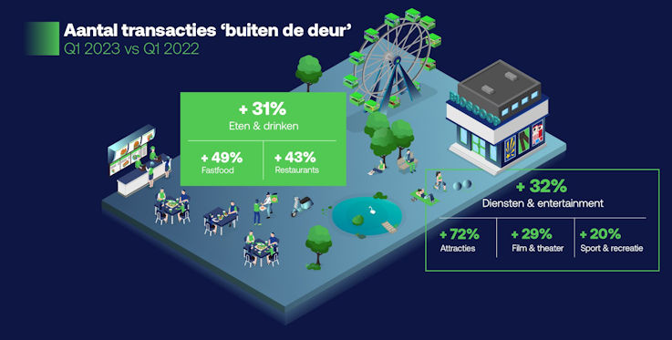 Sinds de heropening van onder andere winkels, horeca, bioscopen en pretparken eind januari vorig jaar en het vervallen van coronarestricties – zoals de anderhalve meter-maatregel en het coronatoegangsbewijs – in februari 2022, is sprake van een inhaalvraag. Naast de flinke stijging in het eerste kwartaal van het totale aantal creditcardtransacties bestemd voor vermaak buiten de deur, valt op dat Eten & Drinken (+31 procent), waar onder meer restaurants onder vallen, fors steeg ten opzichte van dezelfde periode een jaar geleden. Het aantal transacties bestemd voor thuisbezorging nam daarentegen juist af.