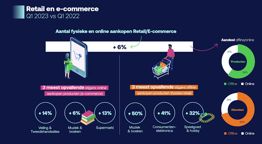 Terwijl de verhouding tussen online shoppen en buitenshuis winkelen in het eerste kwartaal van 2022 nog op 63 versus 37 procent lag, is dit een jaar later verschoven naar 59 versus 41 procent. Consumenten lijken dus langzaam terug te keren naar de winkelstraten. Bij fysieke winkels lag in het eerste kwartaal van dit jaar vooral het aantal aankopen in de categorieën Muziek & Boeken (+50 procent) en Consumentenelektronica (+41 procent) veel hoger dan in dezelfde periode een jaar geleden.