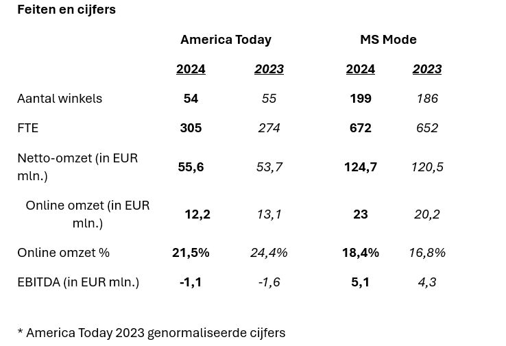 MS Mode vergrootte het aantal filialen naar 199 en sloot tegelijkertijd enkele minder presterende vestigingen. Online werd een omzet van € 23 miljoen geboekt (2023: € 20,2 miljoen), waardoor het online-aandeel steeg naar 18,4 procent. De totale omzet bedroeg € 124,7 miljoen en de EBITDA € 5,1 miljoen.