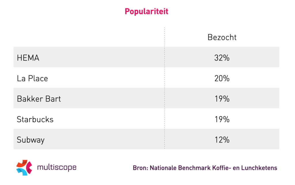 De meerderheid (63%) van de volwassen Nederlanders bezocht in de afgelopen twaalf maanden minstens één koffiezaak of lunchroom. Dat zijn bijna 9,2 miljoen bezoekers. HEMA is de best bezochte keten in Nederland (32%). Een vijfde (20%) van de Nederlanders bezocht La Place. Bakker Bart (19%), Starbucks (19%) en Subway (12%) maken de top vijf compleet.
