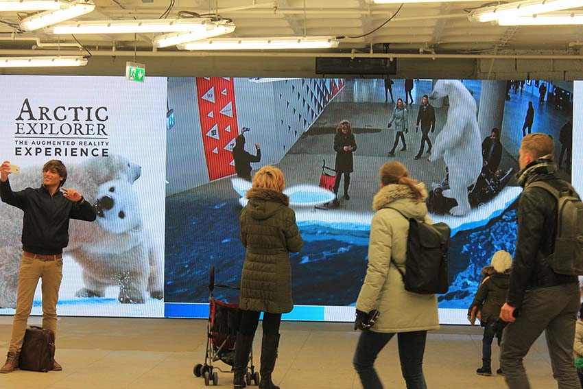 Op het nieuwe 30 m2 grote digitale scherm “The Grand” in winkelcentrum Hoog Catharijne, draait momenteel een augmented “arctic” experience. Door een virtuele laag over de werkelijkheid heen te leggen kunnen er elementen in 3D op het digitale scherm verschijnen. De passant die langs het scherm loopt wordt hierdoor integraal onderdeel van een bijzondere omgeving. Gedurende de wintermaanden is het koude Poolgebied de virtuele omgeving. De augmented reality thema’s zullen per seizoen wisselen.