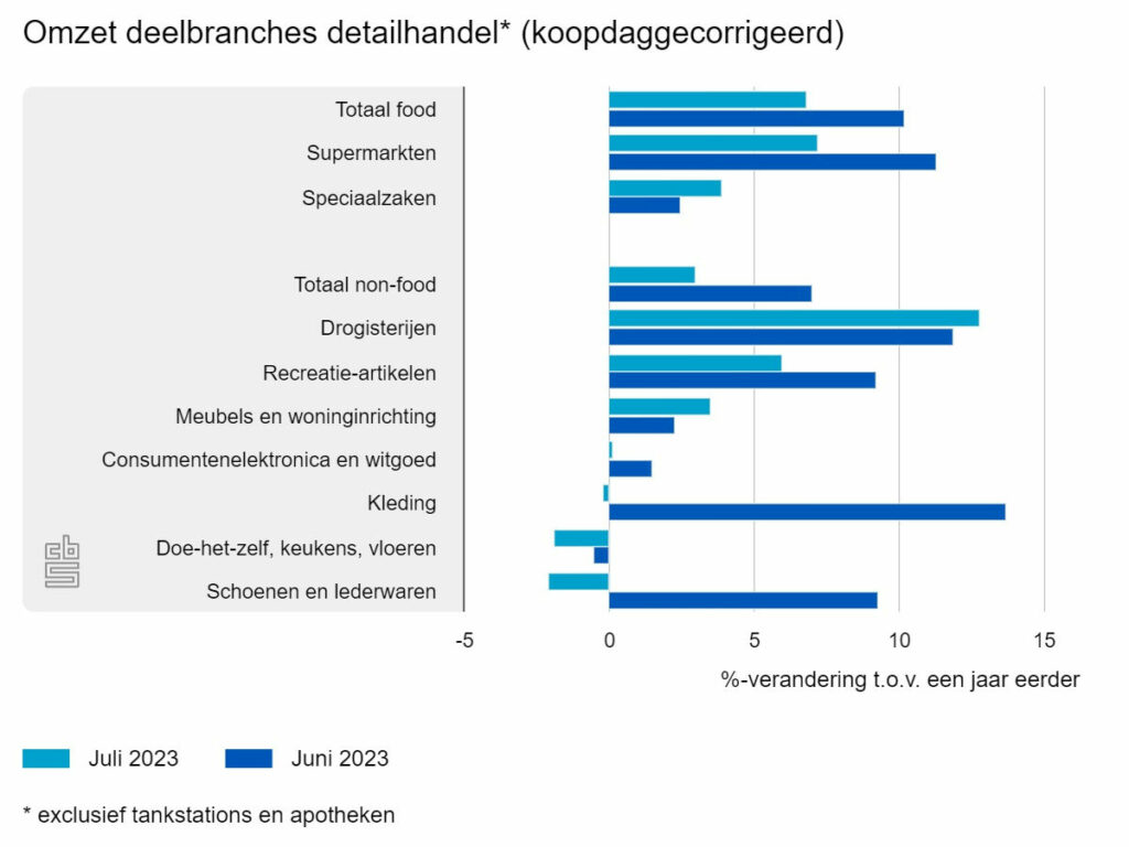 De drogisterijen, de winkels in recreatie-artikelen, de winkels in meubels en woninginrichting en de winkels in consumentenelektronica hebben in juli meer omgezet dan in juli 2022. Daarentegen hebben de kledingwinkels, de winkels in doe-het-zelfartikelen (inclusief keukens en vloeren) en de winkels in schoenen en lederwaren in juli minder omgezet.