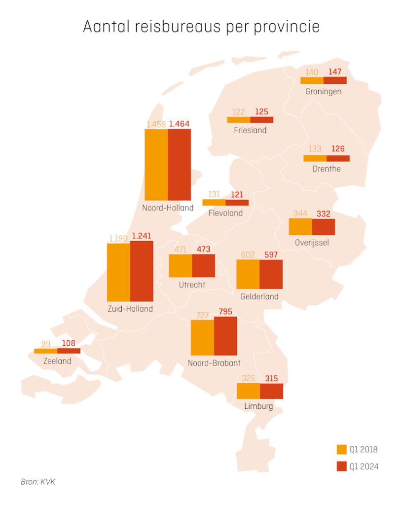 Het aantal in het Handelsregister ingeschreven reisbureaus is de afgelopen jaren nauwelijks gewijzigd. Dit blijkt uit cijfers van de Kamer van Koophandel. In het begin van coronajaar 2020 tikte het aantal bijna de 6.000 aan. Dat was een kleine uitschieter. De jaren erna staat de teller structureel op rond de 5.845 (begin 2024: 5.844), inclusief nevenvestigingen.