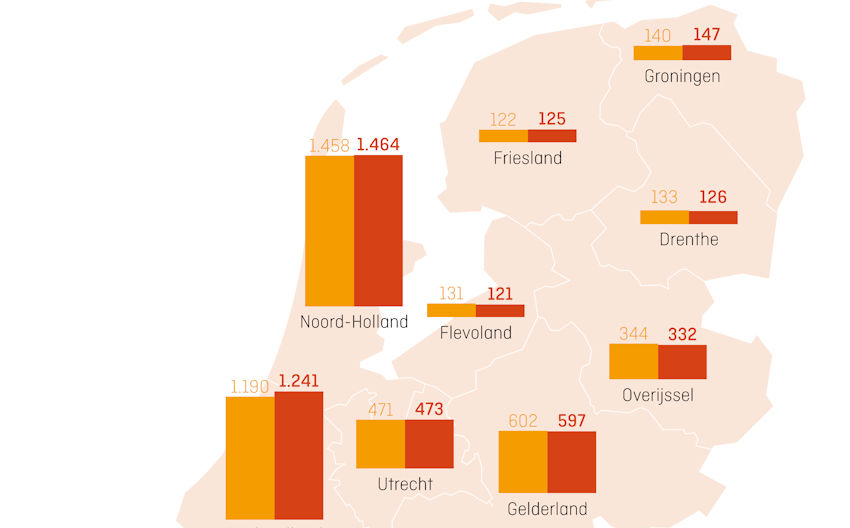 Veruit de meeste reisbureaus zitten in Noord-Holland (1.464) en Zuid-Holland (1.241). Het beeld van de reislustige Randstad houdt stand als je de bevolkingsaantallen bij de cijfers betrekt, deze provincies hebben veel reisbureaus, respectievelijk 50 en 33 per 100.000 inwoners. Wel zijn de onderlinge verschillen tussen provincies dan duidelijk minder groot. Saillant detail is dat Zuid-Holland nipt gepasseerd wordt door Utrecht (34). De meeste andere provincies gaan op reis met tussen de 20 en 30 reisbureaus per 100.000 inwoners.