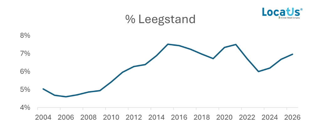 Ondanks deze positieve signalen is de leegstand is in 2025 weer verder gestegen, van 6,7% begin 2025 naar 7,0% nu. Daarmee is de stijging in 2025 wel minder dan in 2024 toen de leegstand steeg van 6,2% naar 6,7%.