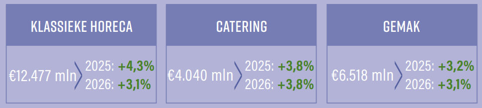 De omzet van dit kanaal groeide in 2025 met 4,3% tot €12,5 miljard, met een lichte toename van het volume. De verwachting isdat de omzet van dit kanaal in 2026 met 3,1% zal groeien. Restaurants profiteren van de groeiende koopkracht, maar personeels en inkoopkosten blijven knellen. Automatisering, voldoende liquiditeit en kostenbesparing zijn noodzakelijk om marges op peil tehouden.