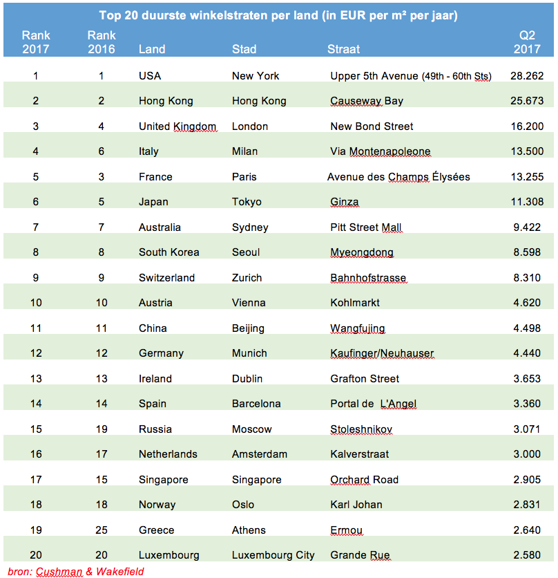 Upper 5th Avenue blijft wereldwijd de duurste winkelstraat met jaarlijkse huurprijzen van gemiddeld € 28.262 per m2/jaar, terwijl Causeway Bay in Hong Kong de tweede plaats behoudt, ondanks een daling in de huurprijzen van gemiddeld 4,7% tot € 25.673 per m2/jaar. New Bond Street in Londen steeg naar de derde positie op de ranglijst als gevolg van een stijging van ruim 37% in 2016 tot € 16.200 per m2/jaar. De stijging ten opzichte van andere topwinkelstraten in de wereld onderstreept de kracht van het winkelvastgoedaanbod in Londen en de aanhoudend sterke vraag naar prime winkelvastgoed in het Londense West End. De Via Montenapoleone in Milaan, waar de huren over 2016 12,5 % stegen tot € 13.500 per m2/jaar, staat vierde. Ondanks onveranderde huurprijzen daalde de Avenue des Champs Élysées in Parijs naar de vijfde plaats met een gemiddelde huurprijs van € 13.255 per m2/jaar.