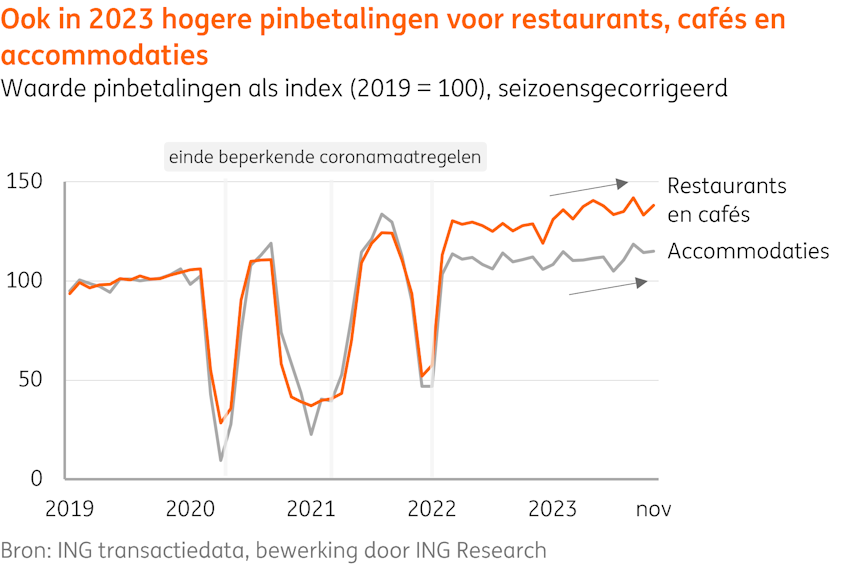 Na de grote post-covid inhaalslag in 2022 en begin 2023, keerde de horeca in het tweede kwartaal van 2023 terug naar een stabieler groeipad. Uit de meest recente ING transactiedata blijkt dat de waarde van de pinbetalingen in 2023 (t/m november) voor restaurants en cafés 13% en voor accommodaties 7% hoger waren ten opzichte van dezelfde periode in 2022. Dit is aanzienlijk, al geven deze cijfers wel een enigszins vertekend beeld. De hoge groei komt enerzijds door prijsverhogingen, van gemiddeld 9%, die de horeca dit jaar heeft doorgevoerd. Anderzijds betreft de groei nog deels herstel van de coronapandemie in het eerste kwartaal 2023, aangezien de horeca in Nederland in de eerste twee maanden van 2022 nog met beperkingen te maken had.
