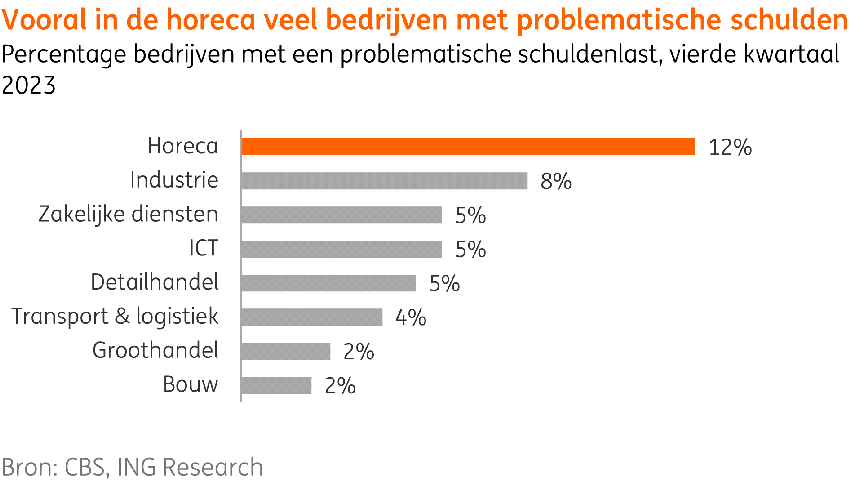 “De marktomstandigheden voor de horeca blijven moeilijk”, stelt Katinka Jongkind, sectoreconoom Leisure bij ING Research. “Naast lagere winstmarges heeft circa één op de acht horecabedrijven een schuldenlast die als problematisch wordt beschouwd. Vooral onder restaurants en cafés wordt de schuld zo ervaren. Sinds oktober 2022 zijn horecabedrijven verplicht begonnen met het terugbetalen van de tijdens de coronaperiode opgebouwde belastingschuld van 1,5 miljard euro. Gezien de verwachting voor een matige groei voor de horeca in 2024, hogere personeelskosten en de coronaschuld die moet worden afbetaald, is de verwachting dat het aantal bedrijven dat stopt of failliet gaat in de horeca in 2024 hoger zal zijn dan in 2023.”