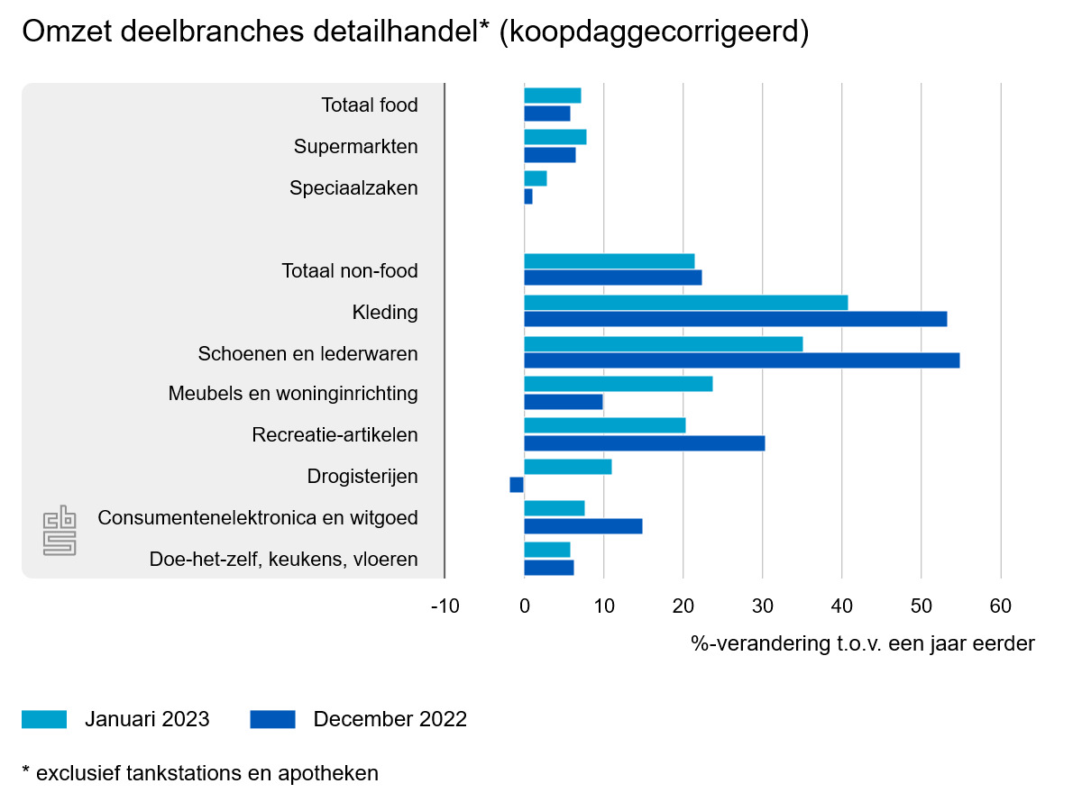 De omzet van de non-foodwinkels groeide in januari 2023 met 21,5 procent. Het volume (de voor prijsveranderingen gecorrigeerde omzet) was 12 procent hoger dan een jaar eerder. De grote groei komt vooral doordat er vorig jaar een lockdown van kracht was tot 15 januari 2022, waar de non-foodsector last van had.