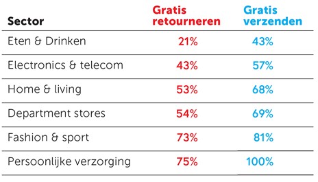 Het (al dan niet) gratis verzenden en retourneren is momenteel een hot topic onder webshops. Sinds Wehkamp begin dit jaar als eerste van de grote webwinkels in ons land retourkosten introduceerde, is de verwachting dat meer partijen zouden volgen. Daarom meldt de Twinkle100 dit jaar bij de grootste webshops (de top-100) hoe de verzending en retouren zijn geregeld. Bij 9% van de top-100 webshops is de verzending te allen tijde gratis, bij 60% is dat gratis vanaf een bepaald aankoopbedrag. 27% van de webwinkels rekent altijd verzendkosten. Retourneren van bestellingen is vaker aan kosten verbonden; zo zien we dat 29% van de webwinkels altijd retourkosten rekent. 13% biedt de mogelijkheid om gratis te retourneren in een fysieke winkel. Slechts 55% van de webshops vergoedt standaard de retourkosten.
