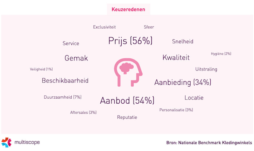Maar liefst 56% van alle klanten kiest voor een kledingwinkel op basis van de ‘prijs’. ‘Prijs’ is daarmee het vaakst genoemd van alle keuzeredenen. De Nederlandse consumenten zijn dus erg prijsbewust. Dit is ook terug te zien in het hoge percentage klanten dat kleding koopt vanwege een ‘aanbieding’ (34%).