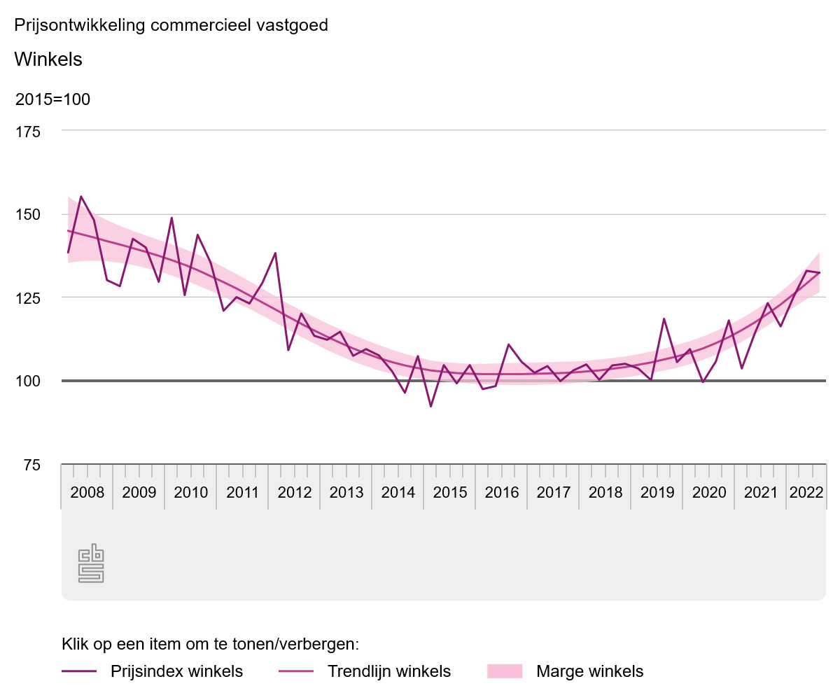 De prijzen van kantoren, industriepanden, winkelpanden en huurwoningen zijn in het derde kwartaal van 2022 gestegen ten opzichte van een jaar eerder. De prijzen van industriepanden stegen met 12 procent het meest, gevolgd door winkelpanden met 10,3 procent en kantoren met 9,8 procent. Huurwoningen kenden de kleinste prijsstijging met 6,7 procent. Hoewel huurwoningen nog steeds in prijs stijgen neemt de stijging al 6 kwartalen op rij in grootte af.