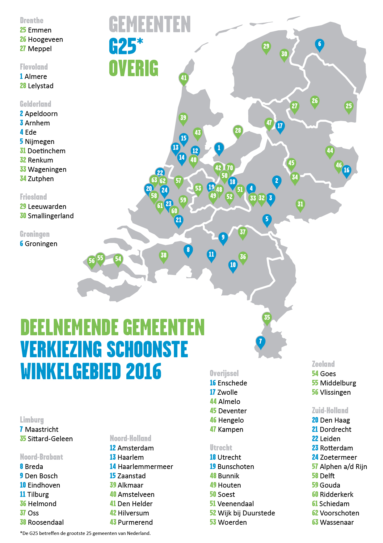 De Schoonste Winkelgebied Verkiezing 2016 is van start gegaan. NederlandSchoon wil met deze verkiezing schoon hoog op de agenda zetten bij gemeenten, ondernemers en beheerders en laatstgenoemden meer betrekken bij het beheer van hun winkelgebied en de openbare ruimte. Winkelgebieden hebben tenslotte een grote impact op de schoonbeleving van Nederlanders.