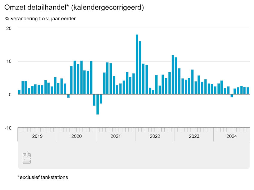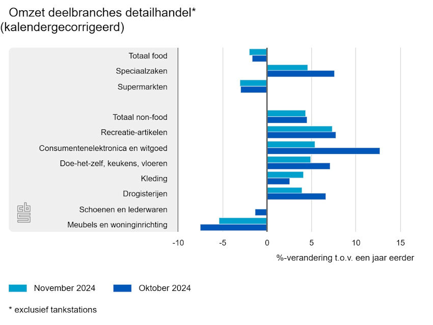 De omzet van de non-food (inclusief detailhandel niet-in-winkel) groeide in november 2024 met 4,4 procent. Het volume (de voor prijsveranderingen gecorrigeerde omzet) was 3,2 procent hoger dan een jaar eerder. De foodsector deed het juist opvallend slechter, waardoor er over het hele retailveld 2,2 procent meer omzet en 0,3% méér verkoopvolume werd genoteerd door het CBS.