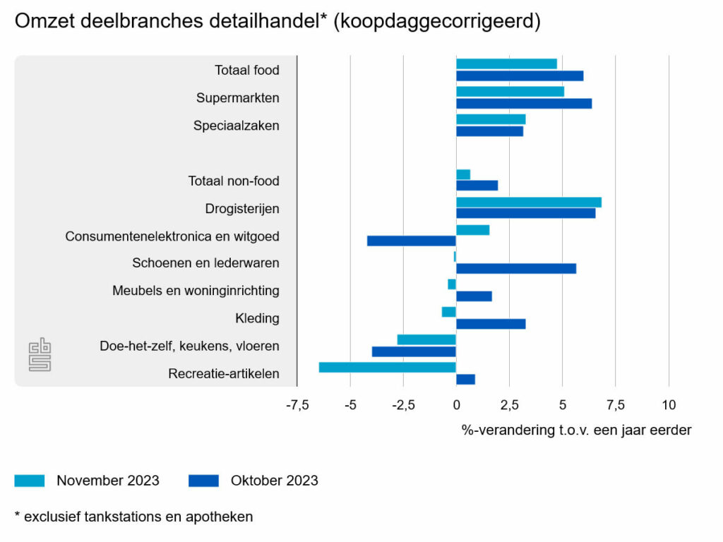 De winkels in voedings- en genotmiddelen hebben in november 4,8 procent meer omzet behaald dan in november 2022. Het verkoopvolume was 1,7 procent lager dan een jaar eerder. De omzet van de supermarkten lag 5,1 procent hoger, de omzet van de speciaalzaken was 3,3 procent hoger.
