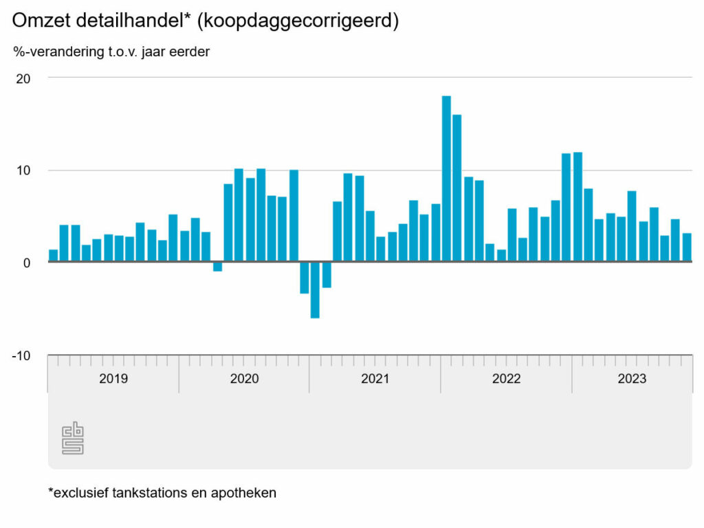 De detailhandel heeft in november 3,2 procent meer omgezet dan in november 2022, meldt het CBS. Het verkoopvolume was 0,8 procent lager. De omzet van de foodsector groeide met 4,8 procent en de omzet van de non-foodsector met 0,7 procent. Online is 0,3 procent minder omgezet dan een jaar eerder.