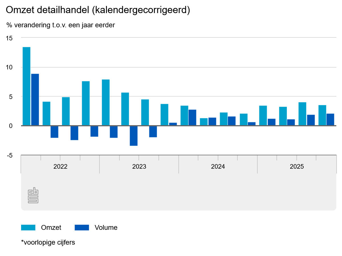 Over heel 2025 boekte de detailhandel 3,6 procent meer omzet dan in 2024 en was het verkoopvolume 1,6 procent hoger.