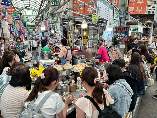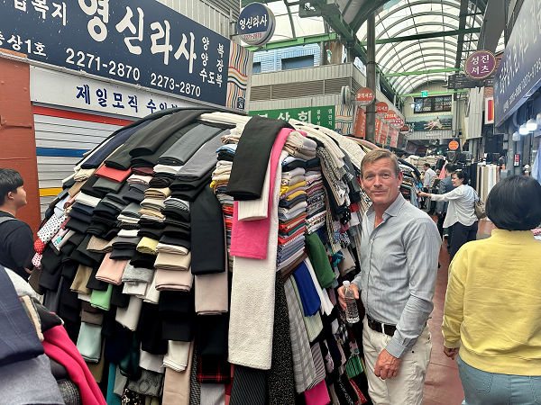 Twee markten hebben wij mogen aanschouwen. Onze favoriet betreft Gwanjang Market. Ook de plek waar er geluncht werd. Heerlijke plek. Drukke plek. En de plek waar de doorsnee Koreaan de tijd van zijn leven heeft. De focus ligt op voedselverkoop. Maar ook de stoffenmarkt mag er wezen (foto Tom vd Vliet).