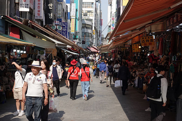 Veel organisch gegroeide winkelgebieden zijn door ons bezocht. Zoals het Myeongdong-district. Het betreft een typisch A1-winkelmilieu. Maar liefst drie warenhuizen vormen de ankerpunten van dit uitgestrekt winkelgebied, te weten de Shinsegae, Lotte én Lotte Young Plaza. Overige winkels betreffen zowel het luxe segment als het hoge middensegment. Opvallend: er zijn bijna geen terrassen in de open lucht te vinden, behalve dan ‘rooftop’-terrassen, waarvan de helft gesloten bleek te zijn. Uiteindelijk is het tóch gelukt om buiten een drankje te scoren (foto met bier).